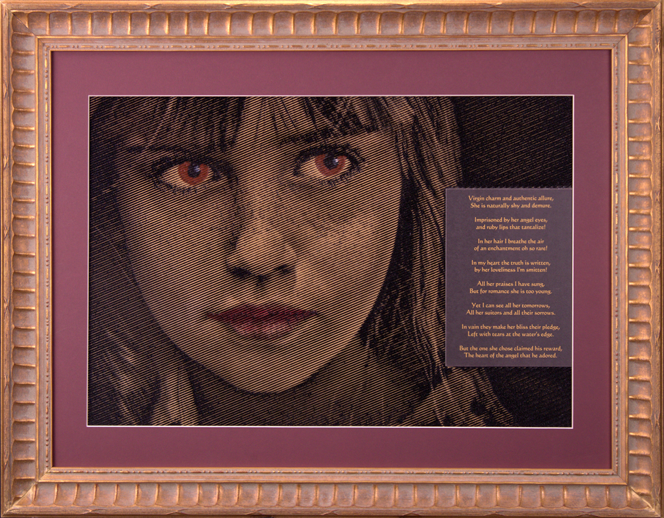 An original poem that we compose at your direction, usually placed either on the carving itself as an attractive card or on a matching laser-engraved wood canvas designed to be mounted next to (or near) the main canvas.